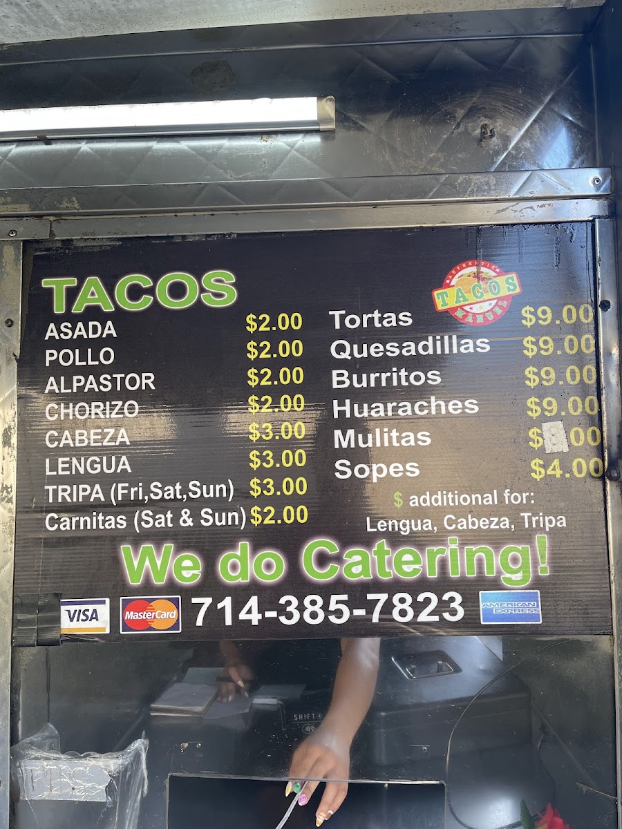 Introducing Tacos Manuel, a hidden gem located on Mabury St in Santa Ana, CA, where the vibrant flavors of authentic Mexican cuisine come alive. Specializing in a variety of mouthwatering tacos, including Asada ($1.75), Pollo ($1.50), Alpastor ($1.50), and the decadent Lengua and Cabeza ($2.00), the menu provides a delightful experience for any taco enthusiast.